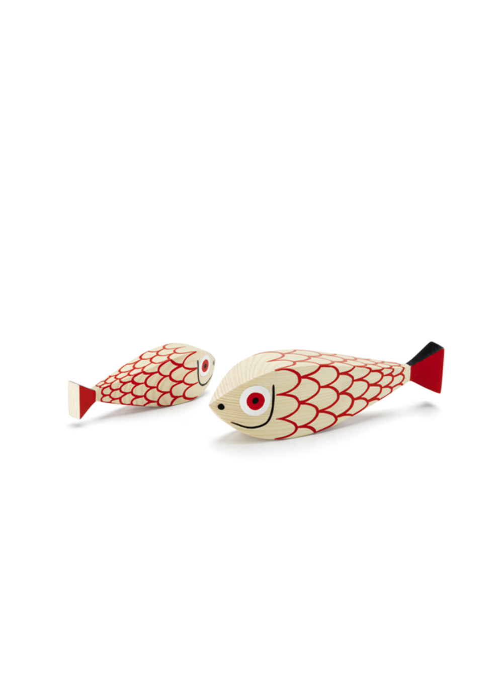 Les deux poissons – une mère et son petit – ajoutent une nouvelle thématique du monde animal à la joyeuse famille des Wooden Dolls d’Alexander Girard.