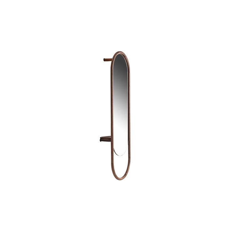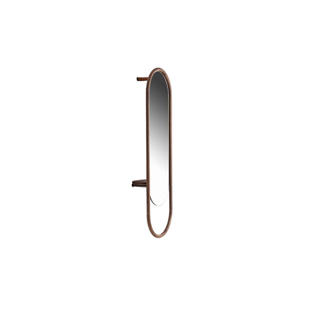 Miroir avec cadre en noyer canaletta massif. A l’arrière du miroir se trouvent un plateau en bois et une barre de penderie revêtue en Cuoietto. Possibilité d’ajouter jusqu’à 3 cintres, avec ou sans pince.