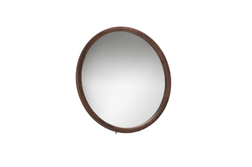 Miroir rond avec cadre en noyer canaletta massif à fixer ou à poser contre le mur. Enlever les pieds de soutien pour le fixer au mur.