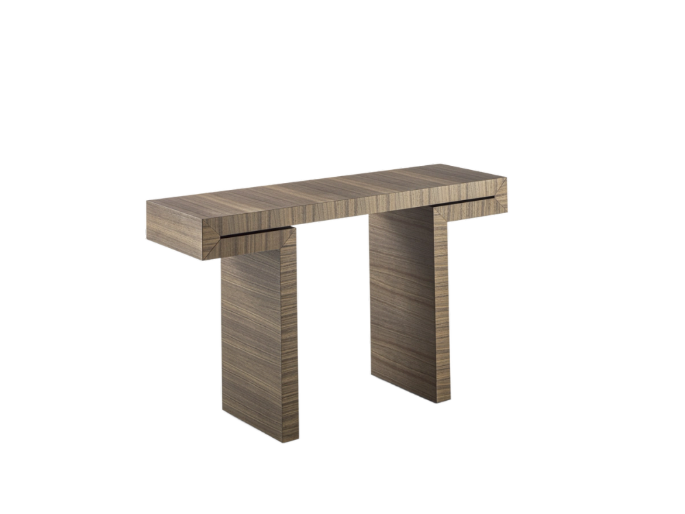 Console en noyer canaletta ou chêne spessart. La veine du bois suit l’ensemble de la ligne de la console.