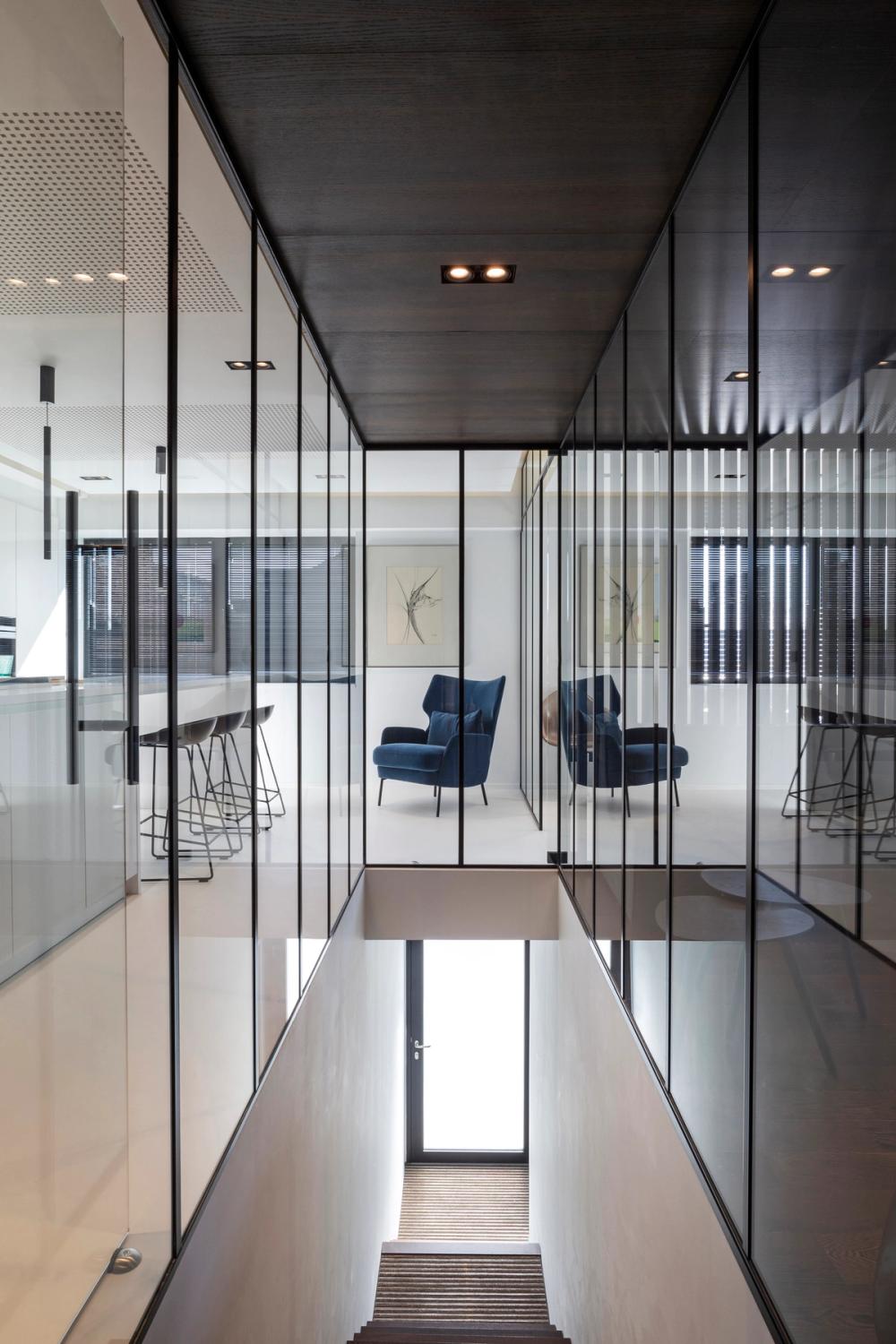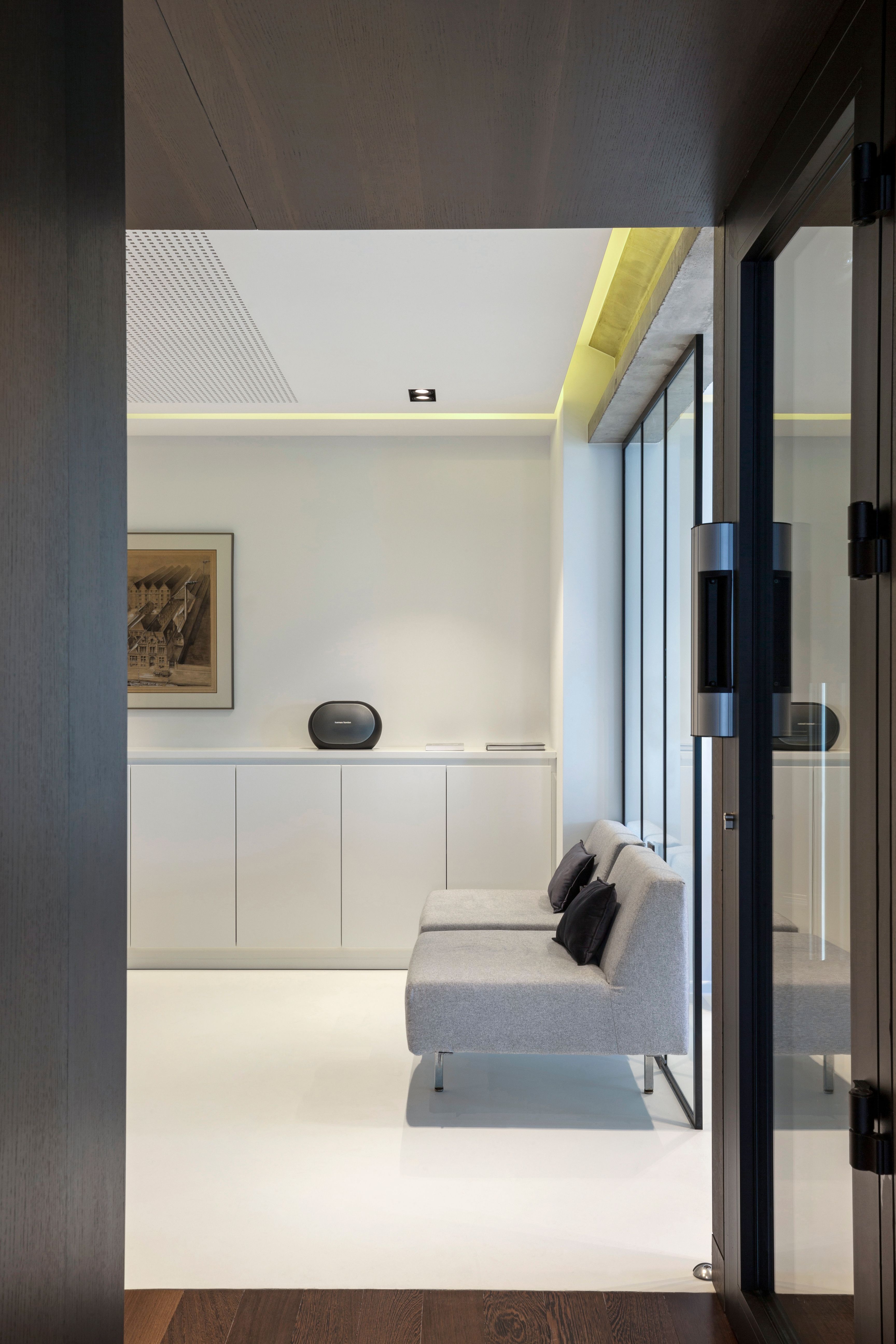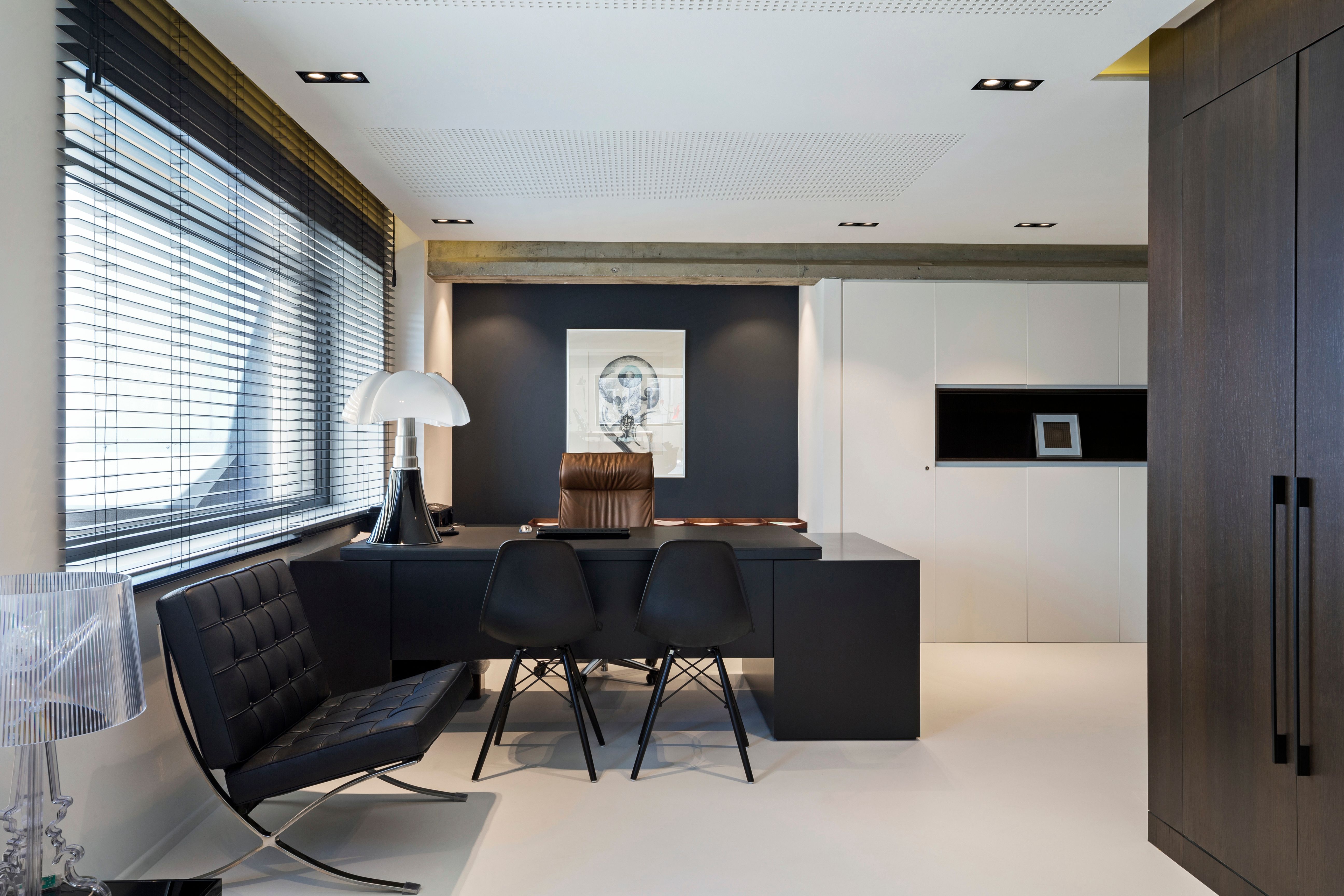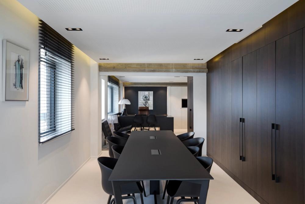 Dans cet espace de bureaux bruxellois, nous avons imaginé un aménagement où l’élégance du noyer dialogue avec la force brute du béton. Au centre, une boîte technique habillée de noyer structure l’espace : autour d’elle s’organisent les différents bureaux, dans un jeu de volumes fluides et maîtrisés.