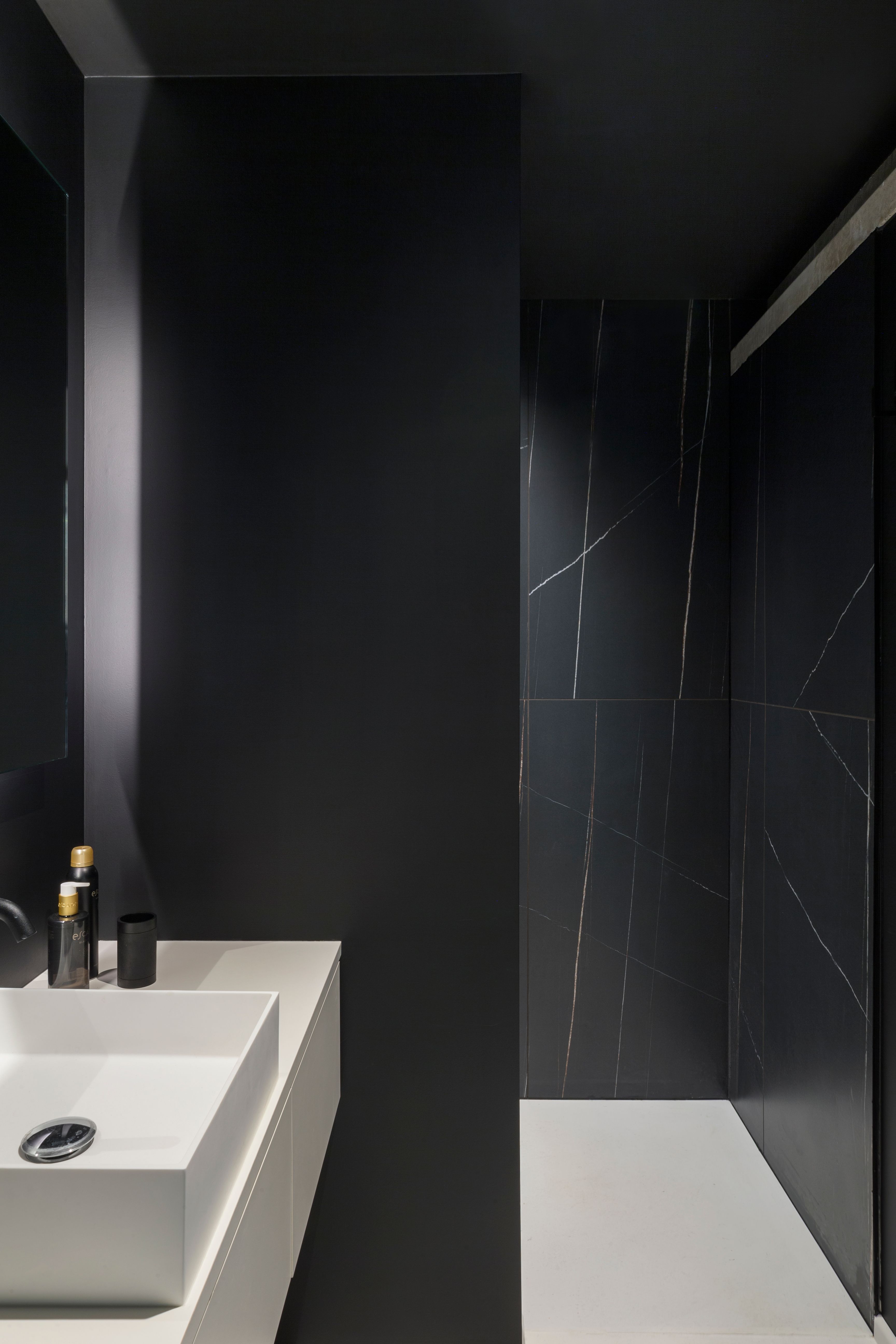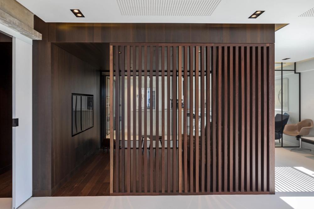 Le bardage ajouré en noyer crée une sensation de rythme et de légèreté, tandis que le vitrage noir structuré délimite les espaces tout en conservant une belle transparence. Le mobilier noir, rehaussé de touches de noyer, fait écho à l’enveloppe du bâtiment et valorise la matérialité des lieux. Un projet à la fois rigoureux, graphique et chaleureux.